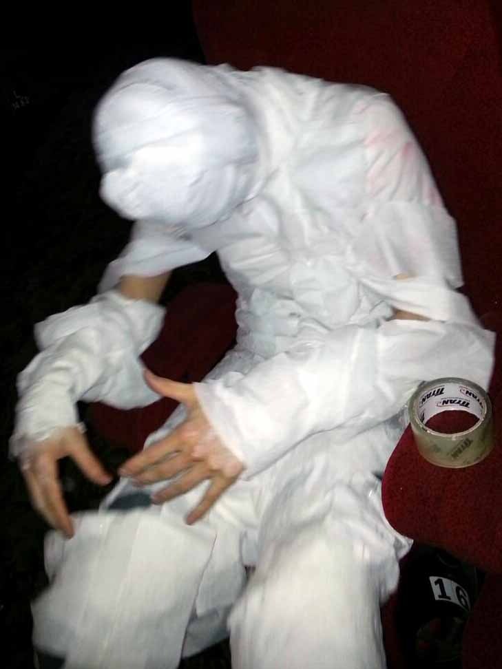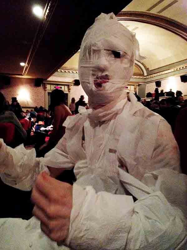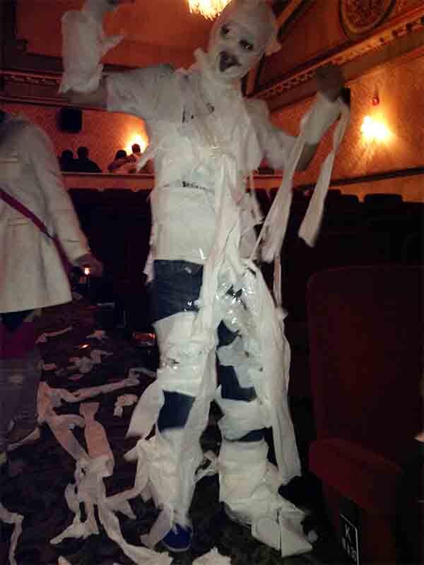 As if that wasn’t enough horror-themed fun, I then went to a screening of the Rocky Horror Picture Show dressed as a mummy. A word of advice for all the mummy-wannabes out there: don’t rely solely on sellotape to hold a mummy costume together. This is because after ten minutes, my costume fell off, and for the rest of the evening I was just a sad man with toilet roll stuck to his chest. In fact, my costume was so bad that I was even refused entry to the costume contest, even though I would have lost anyway as I’m pretty sure that traditionally mummies don’t wear jeans and trainers. Screw them all, I say; I thought my costume was awesome. I was enthralled by the fact that every time scraps of toilet paper fell off, I broke littering laws. The only part that stayed on was my head, which I believe actually looked quite frightening.