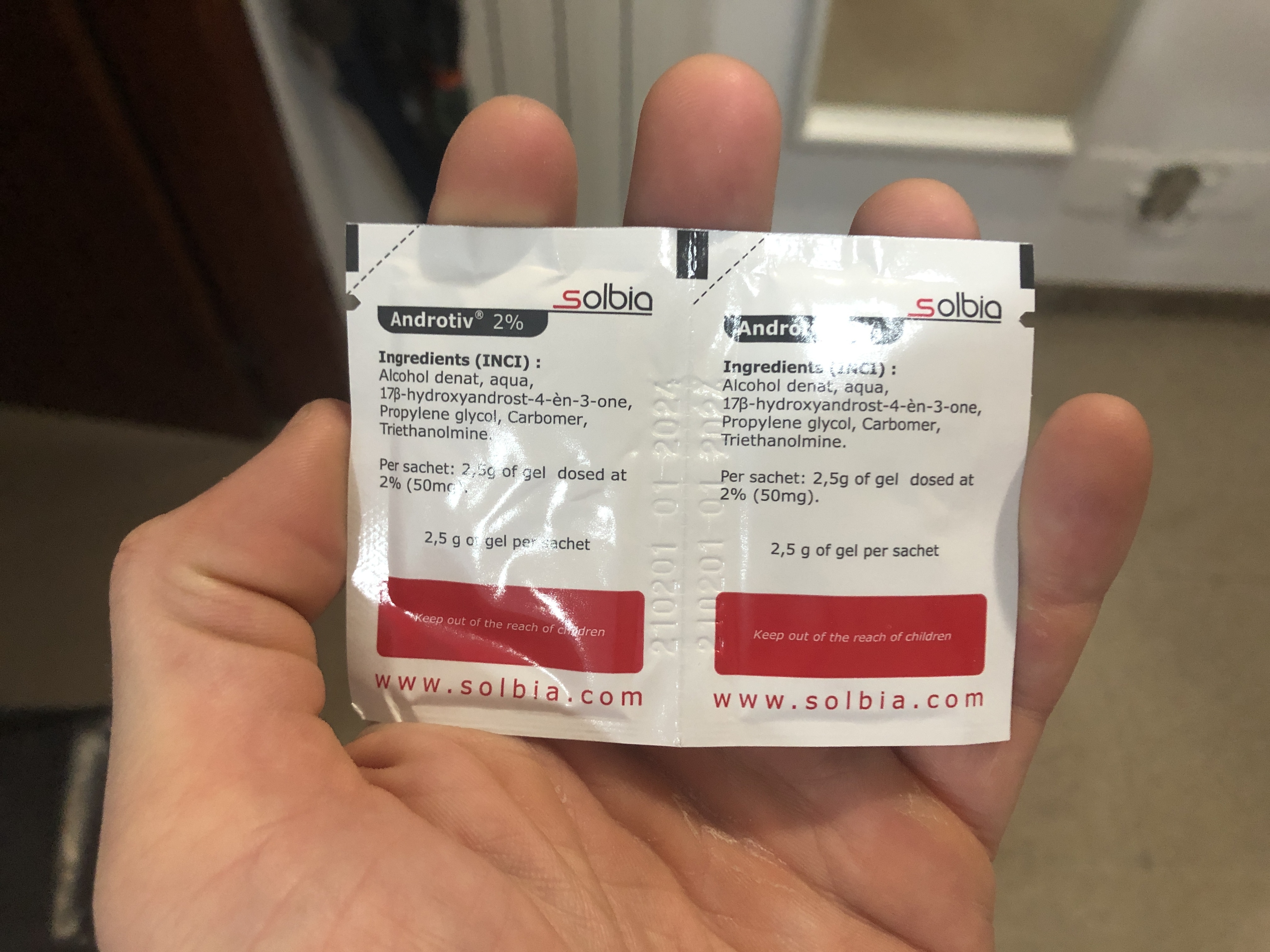 So the Androtiv was a revelation. It's easy to use. You just open the packet, squeeze out the contents onto your body, and rub it in. It only takes a minute, it doesn't hurt, and there's no chance of getting a needle infection.