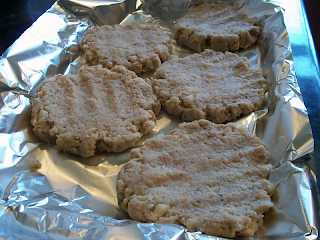 - On the tray, make several 'burgers' shapes by creating balls then squashing them flat. Perhaps with a circular cutter you could get perfectly round shapes, but I don't mind irregularly-shaped fishcakes myself.